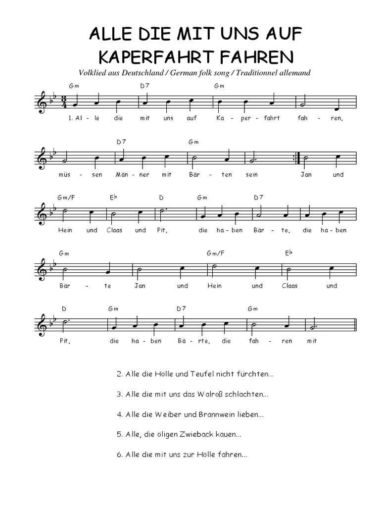 Die haben Bärte, die fahren mit. Alle, die Tod und Teufel nicht fürchten, Müssen Männer mit Bärten sein. Alle, die Tod und Teufel nicht fürchten, Müssen Männer mit Bärten sein. Jan und Hein und Klaas und Pit, Die haben Bärte, die haben Bärte. Jan und Hein und Klaas und Pit, Die haben Bärte, die fahren mit.