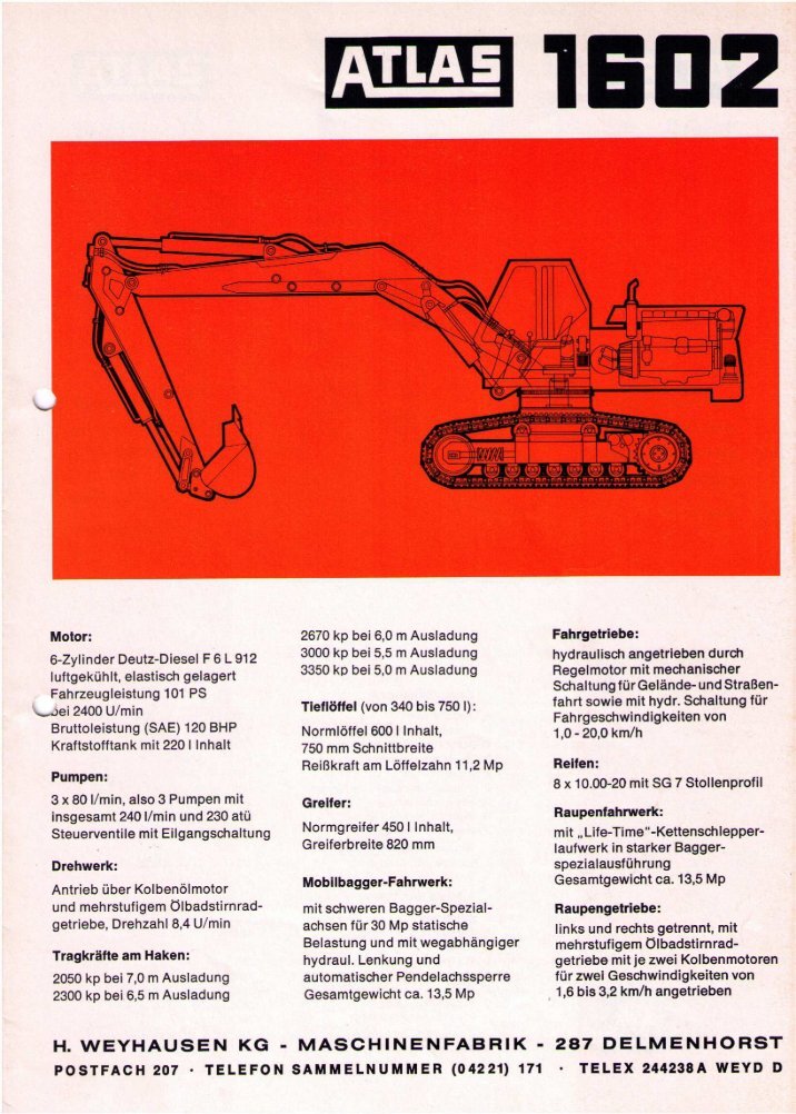 Bauprogramm 01. A—LAS VOLLHYDRAULIK BAGGER UND LADER AT LAS H. WEYHAUSEN KG. MASCHINENFABRIK, 287 DELMENHORST. ATLAS Hinter diesem Zeichen stehen hochqualifizierte Facharbeiter, Techniker und Ingenieure. ATLAS Vollhydraulik Bagger und Lader Sind seit vielen Jahren bei der Fachwelt des ln- und Auslandes ein Begriff für Hochlei- stungsmaschinen.