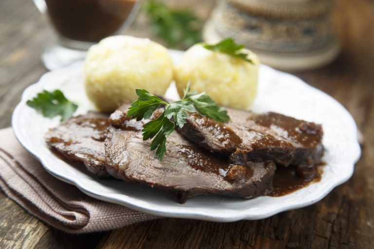 Ein klassischer Sauerbraten vom Rind ist nicht nur leckere Hausmannskost, es ist Comfort-Food vom Feinsten. Ein Gericht, das gut tut und bei vielen Menschen schöne Erinnerungen weckt. Sauerbraten passt perfekt, für das gemütliche Mittagessen an Sonn- und Feiertagen und ist ein echter Klassiker, wenn er mit Rotkraut und Knödel serviert wird.