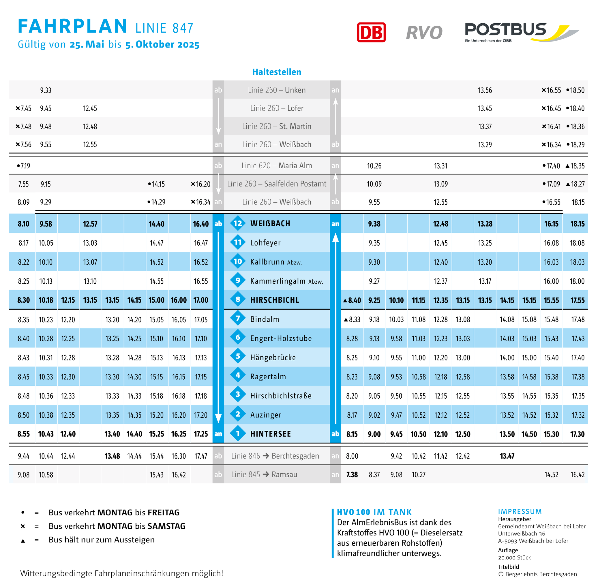 A = Montag - Freitag vom 02.05. bis 03.11.2023 = behindertengerechter Bus (soweit betrieblich möglich, ohne Gewähr) _ = Fahrt beginnt um 13.00 Uhr an der Realschule Gmund. Fahrplan gültig ab 1. Mai 2023 Weitere Haltestellen in Tirol siehe Linie 9550 An Feiertagen Betrieb wie Sonntag. Am Buß- und Bettag Betrieb nach Ferienfahrplan.