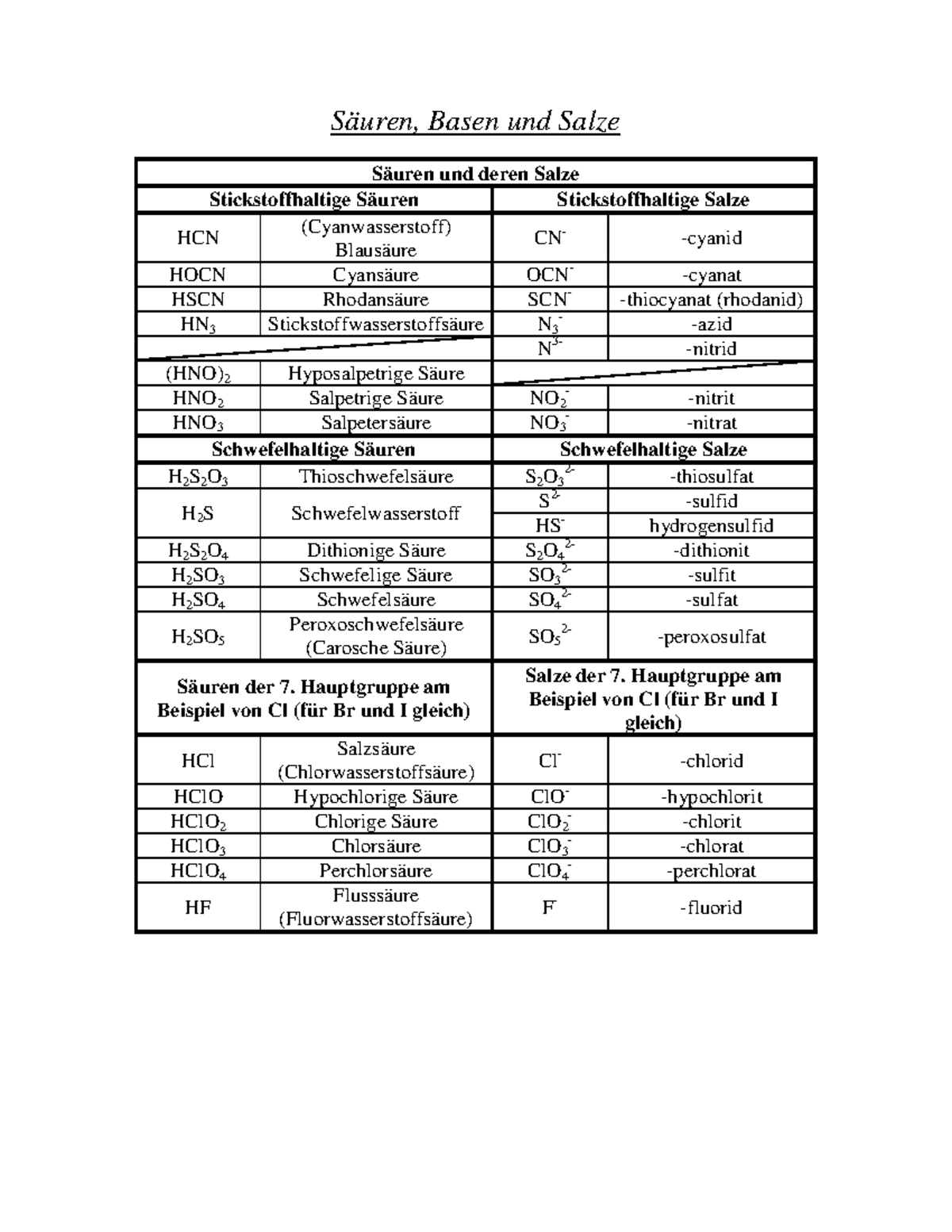 Säuren Basen Salze Zusammenfassung Tabelle Säuren, Basen und Salze Säuren und deren Salze